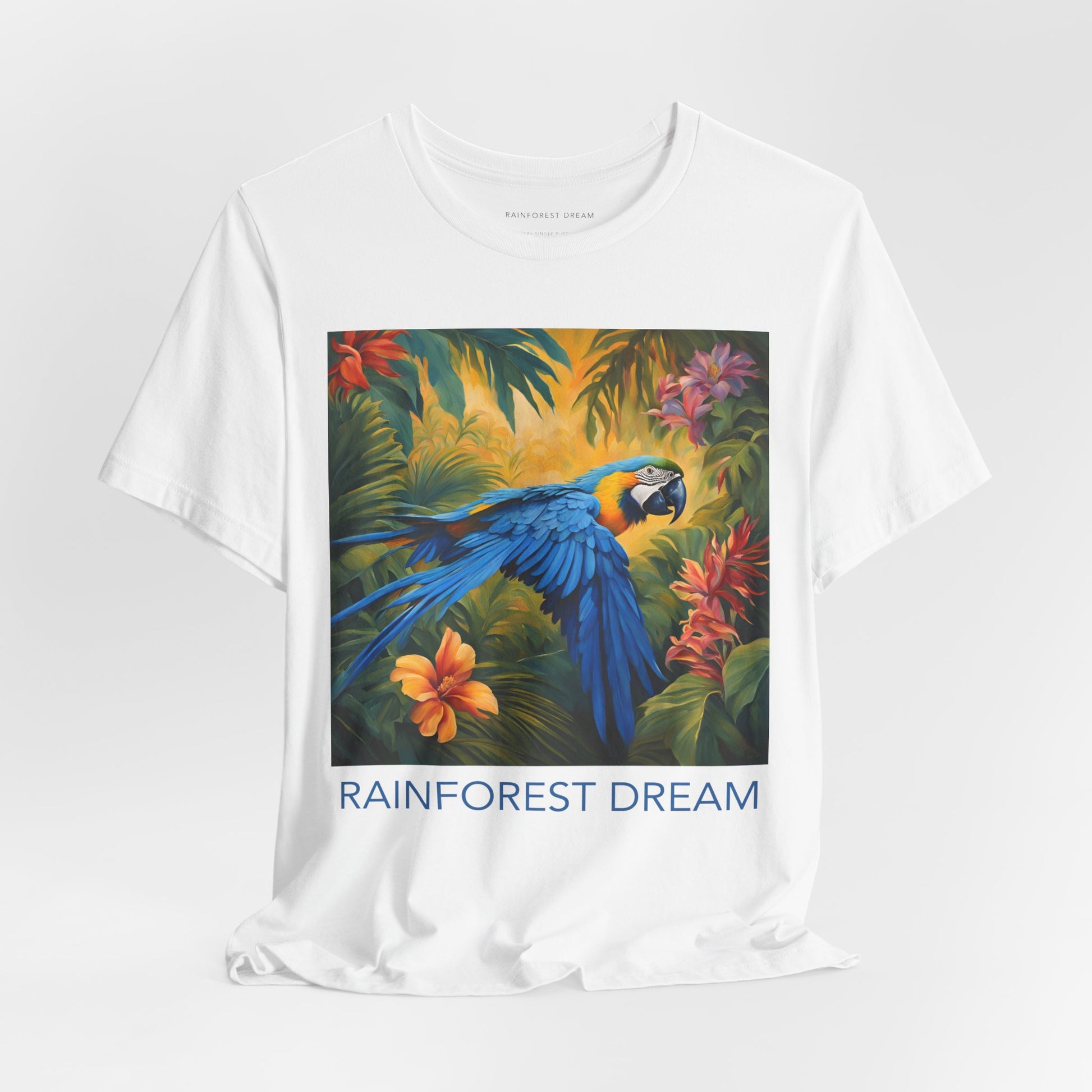 A classic tee with a vibrant blue macaw flying amongst rainforest flowers. Perfect for nature lovers and those who appreciate artistic designs. Casual wear or a statement piece or a unique tropical addition at the beach. Feel good about your clothing knowing you're helping save the habitat of the blue macaw.